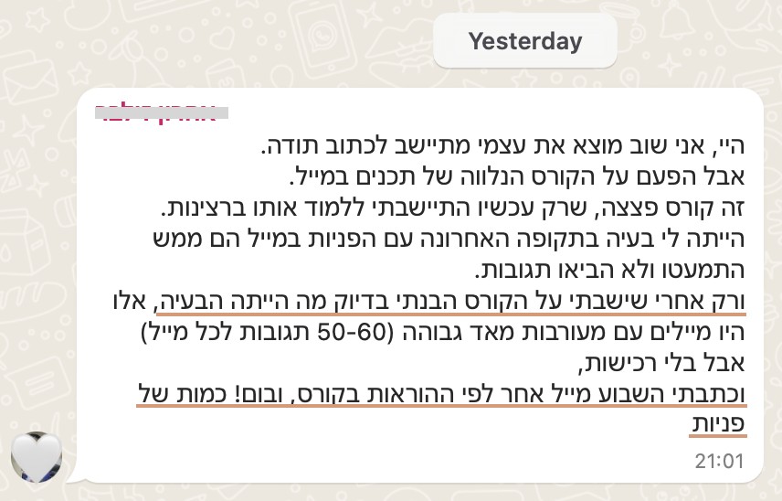 השיעורים נשארים אצלכם. תוכלו לקרוא ולצפות בהם בזמן ובקצב שנוח לכם, ולחזור אליהם בכל פעם שאתם צריכים ריענון.