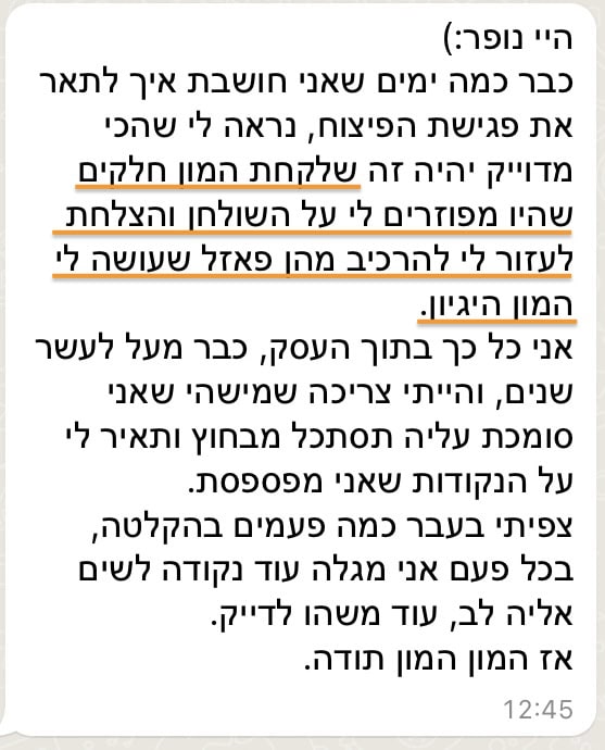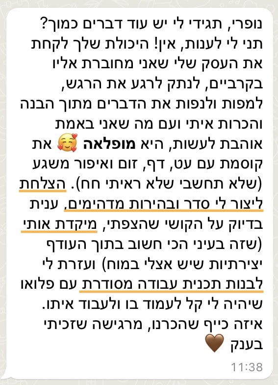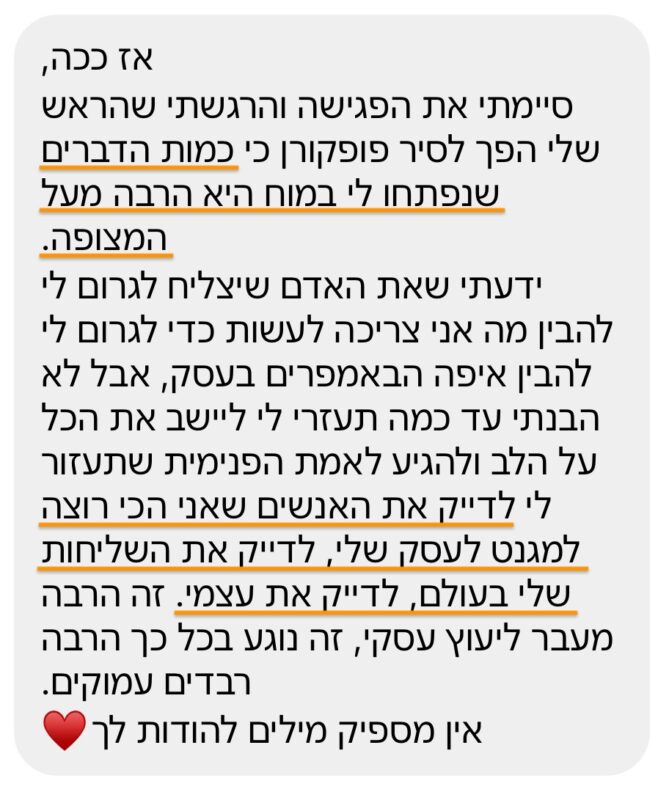 בפגישה אנחנו נפצח, נדייק, ונגדיר את קהל היעד והמסרים שלך, ונבין איך לדבר אליו בצורה שתעביר את הערך שיש לך לתת. -