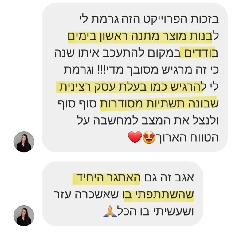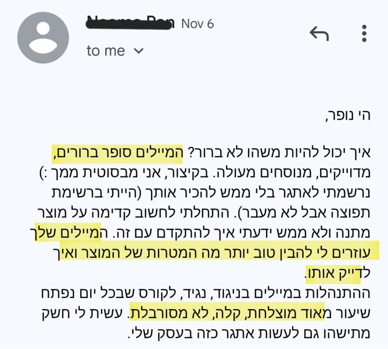 אפשר לשאול אותי שאלות במייל חוזר ואענה ככל שאוכל. יחד עם זאת, הפרויקט לא כולל בדיקת חומרים או ייעוץ אישי על בחירת הנושא / כתיבת תכנים וכד׳. אלו מצריכים היכרות מעמיקה עם העסק שלך ואת זה אנחנו עושים בתוכניות הליווי שלנו.