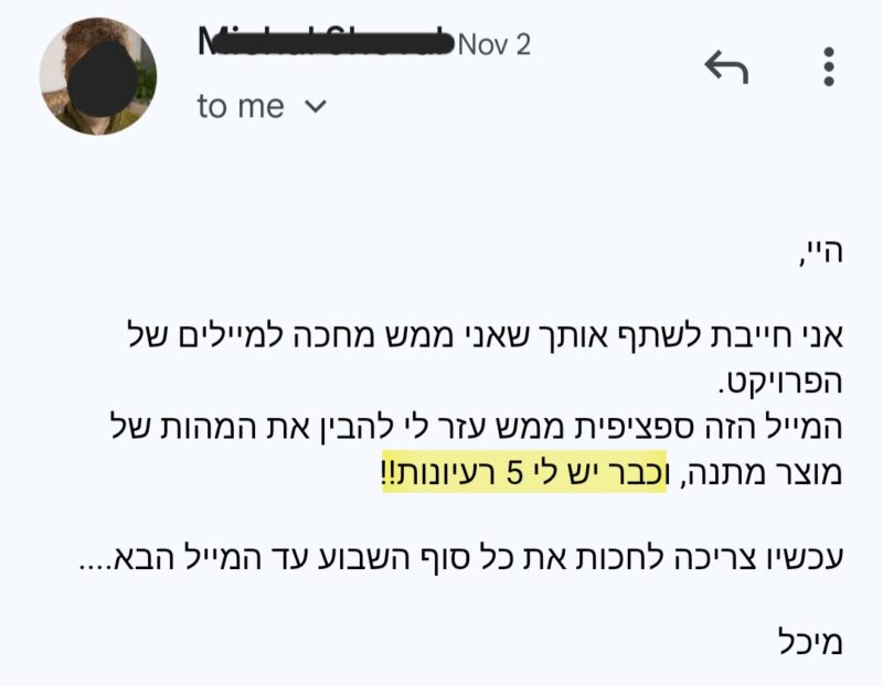 ותוך כמה דקות תקבל ממני את המייל הראשון עם המשימה הראשונה שלך