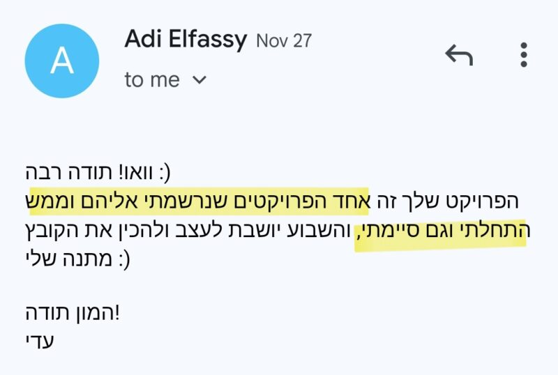 תכני הפרוייקט נשארים אצלך במייל 🙂 ככה שתמיד אפשר לחזור אליהם מתי שנוח לך ולעשות את התרגילים בקצב שלך.