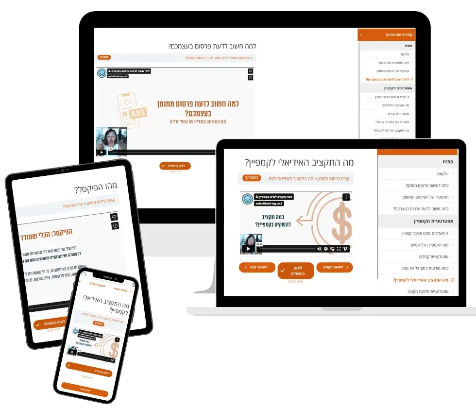 הקורס הוא קורס דיגיטלי והוא מורכב מ-5 מודולים, מעל 42 שיעורים, שילמדו אותך שלב אחר שלב איך להעלות קמפיין ברמה הטכנית + ברמה האסטרטגית.