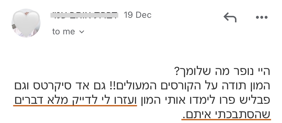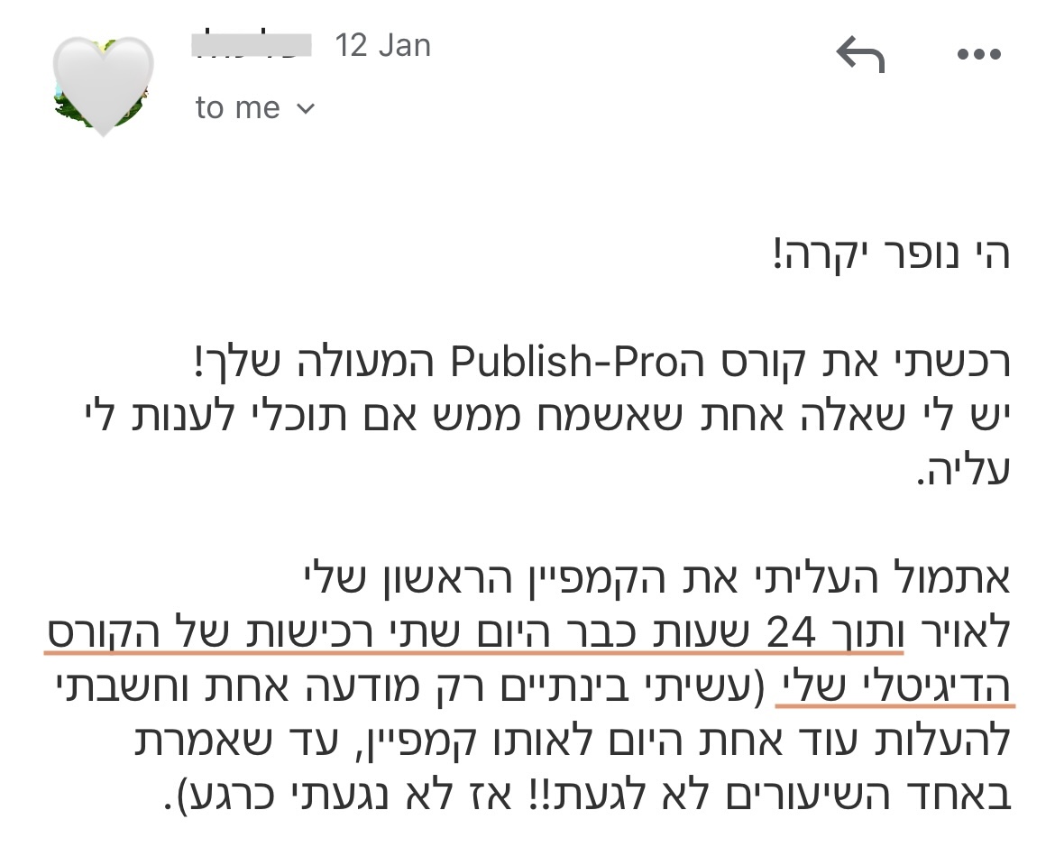 אחרי התשלום תקבלו מיד את פרטי הגישה של הקורס למייל ותוכלו להתחיל לעבוד: